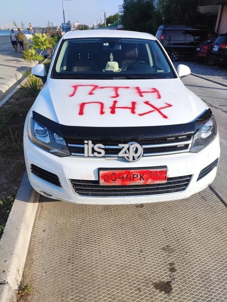 В Бердянске неизвестные разрисовали белый Volkswagen и черный Chevrolet с российскими номерами. На авто написали красным баллончиком "ПТН ПНХ".