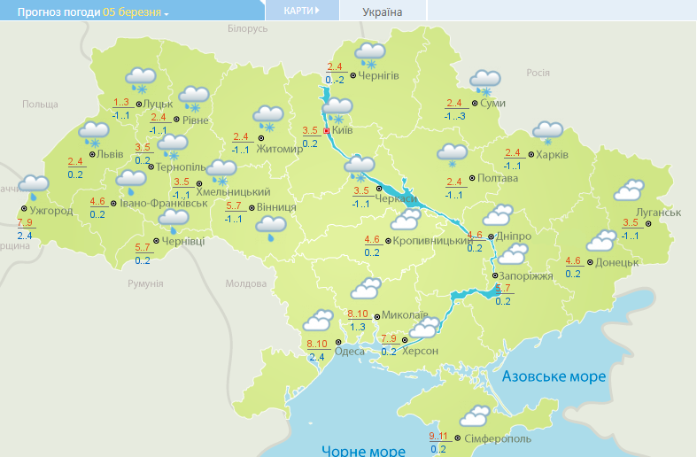В ближайшие дни погода в Украине, несмотря на начало календарной весны, будет зимней - 2 и 3 марта ожидаются снегопады и ледяные дожди, температура упадет до 4° мороза ночью, а 5 марта осадки накроют большую часть страны.