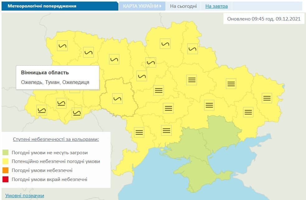 "До конца суток 9 декабря ночью и утром 10 декабря в большинстве областей страны туман, видимость 200-500 м; в большинстве западных, северных и Винницких областях гололедица, на дорогах гололедица (и уровень опасности, желтый)", - отмечается в ведомстве.