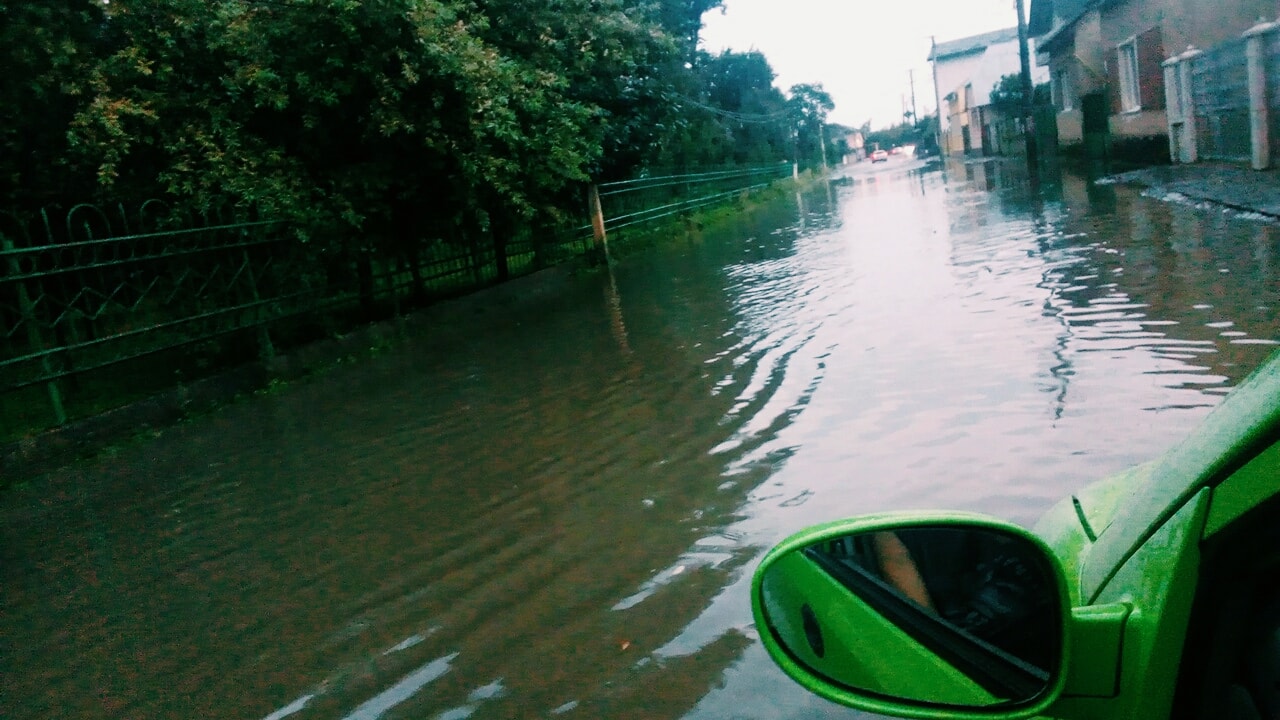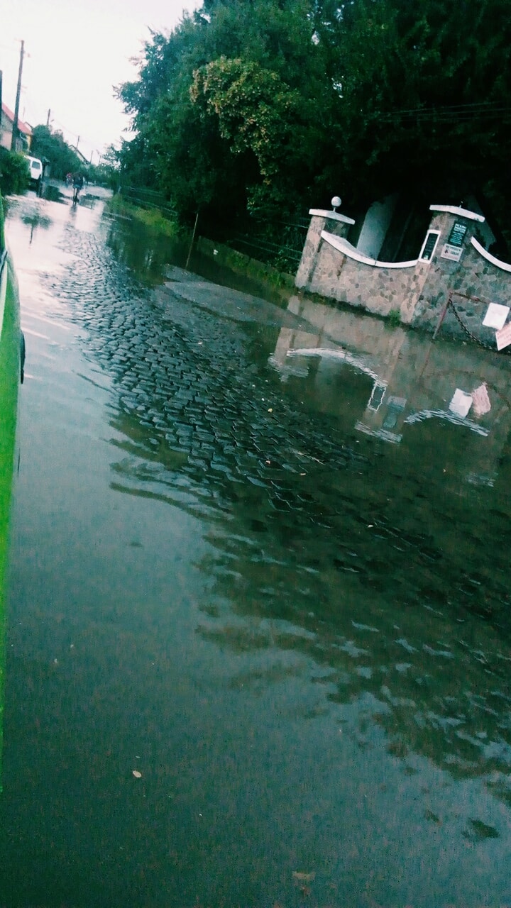 Пользовательница Zsupanin Natália опубликовала фото потопа на улице О.Гандери. По воде идет рябь, как по реке.