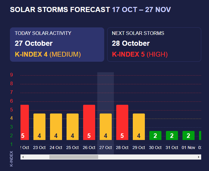 Очередной скачок солнечной активности достигнет уровня 5, что соответствует сильной магнитной буре. Уже на следующий день, 29 октября, солнечная активность упадет до К-индекса 4, что является средним показателем.