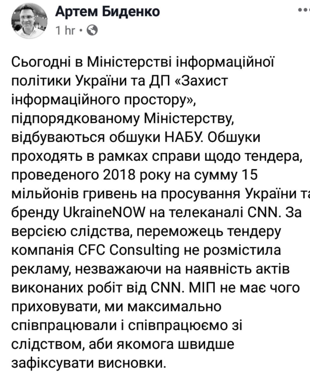 "Сегодня в Министерстве информационной политики Украины и ГП "Защита информационного пространства" , подчиненном Министерству, происходят обыски НАБУ. Обыски проходят в рамках дела о тендере, проведенном в 2018 году на сумму 15 миллионов гривен на продвижение Украины и бренда UkraineNOW на телеканале CNN", - написал Биденко.