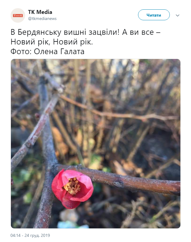 "В Бердянске вишни зацвели! А вы все - Новый год, Новый год", - говорится в сообщении.