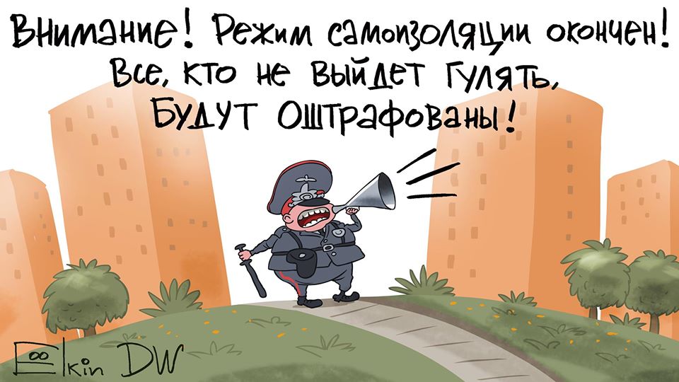 "Внимание! Режим самоизоляции закончен! Все, кто не выйдет гулять, будут оштрафованы", - подписал Елкин свою карикатуру.