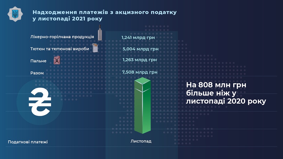 Поступления платежей по акцизному налогу на производимые в Украине подакцизные товары (ликерно-водочная продукция, горючее, табак и табачные изделия) составляли в ноябре 2021 года 7,508 млрд грн, что на 808 млн грн больше, чем в ноябре 2020 года.