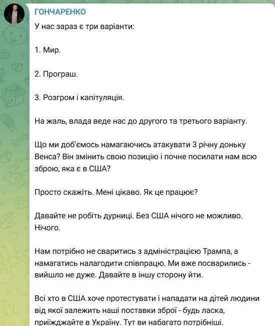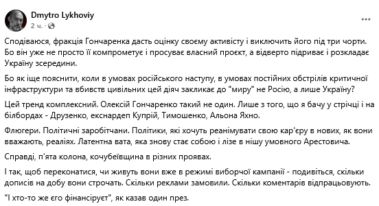 "Алексей Гончаренко такой не один. Лишь из того, что я вижу в ленте и на билбордах - Друзенко, экс-нардеп Куприй, Тимошенко, Алена Яхно. Флюгеры. Политические работники. Политики, которые хотят реанимировать свою карьеру в новых, как они считают, реалиях. Латентная вата, которая снова становится собой и лезет в нишу условного Арестовича. Действительно, пятая колонна, кочубеевщина в разных проявлениях. И так, чтобы убедиться, живут ли они уже в режиме избирательной кампании - посмотрите, сколько сообщений в сутки они строчат. Сколько рекламы заказали? Сколько комментариев отрабатывают...", - сообщил представитель ВСУ, добавив скриншот сообщения Гончаренко.