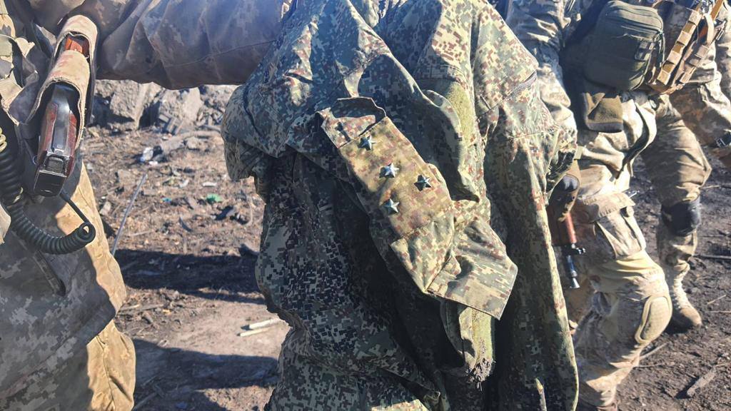 Кроме того, бойцам украинской армии в руки попали остатки российской военной формы с погонами с 4-мя звездочками - это звание "капитан".