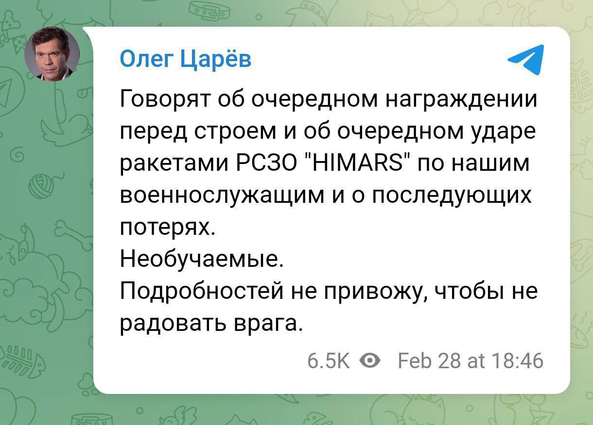 Российские Telegram-каналы и коллаборант Олег Царев пожаловались, что украинские военные снова ударили по российским оккупантам во время награждения.