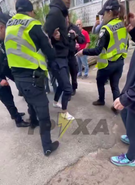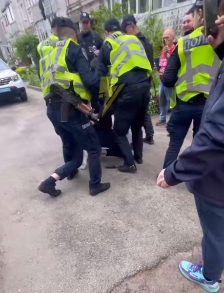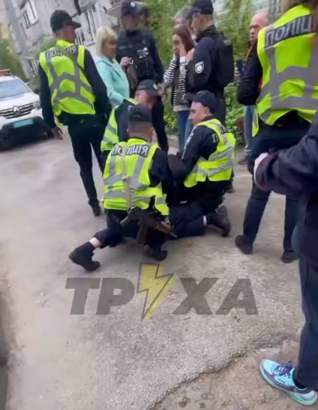 На кадрах видно, как около десятка работников Национальной полиции в окружении местных жителей повалили на землю мужчину.