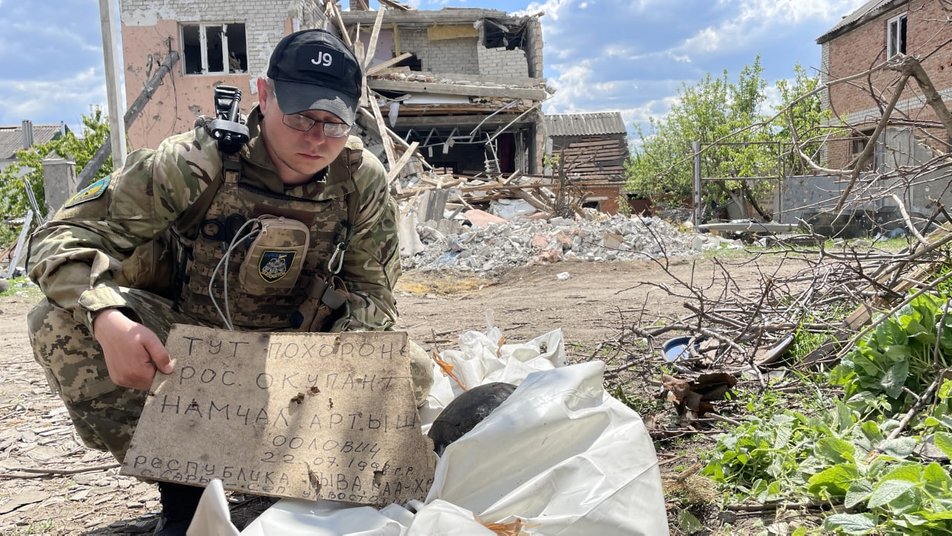 При эксгумации находят не только тела, но и бронежилеты, каски и карточки российских банков. На одном из захоронений была табличка из картона с надписью "Тут похоронен российский окупант Намчал Артыш Оолович, 22.07.1998, Республика Тыва".