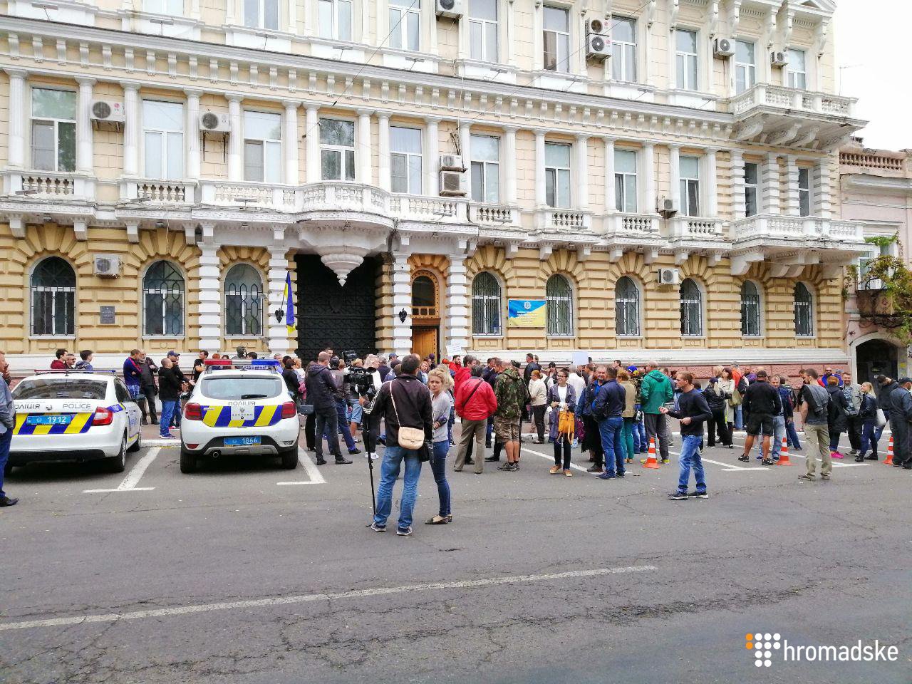 Как сообщает издание, присутствующие под зданием ГУ Нацполиции требовали, чтобы к ним вышел руководитель органа Дмитрий Головин, однако его заместители говорят, что этого нет на месте.