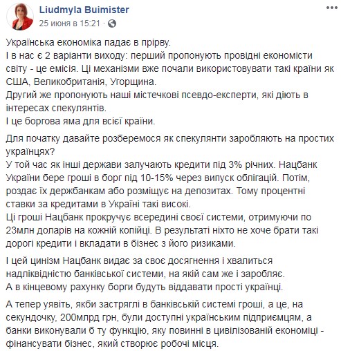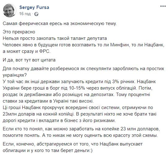 "В то время как другие государства привлекают кредиты под 3% годовых. Нацбанк Украины берет деньги в долг под 10-15% через выпуск облигаций. Затем, раздает их госбанкам или размещает на депозитах. Поэтому процентные ставки по кредитам в Украине такие высокие. Эти деньги Нацбанк прокручивает внутри своей системы, получая по 23 млн долларов на каждой копейке. В результате никто не хочет брать такие дорогие кредиты и вкладывать в бизнес с его рисками", - написала нардеп.