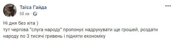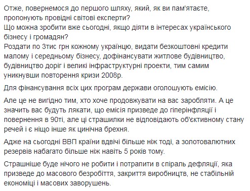 "Раздать по 3 тыс. грн каждому украинцу, выдать бесплатные кредиты малому и среднему бизнесу, дофинансировать жилищное строительство, строительство дорог и крупные инфраструктурные проекты, тем самым избежав повторения кризиса 2008 года", - заявила Буймистер.