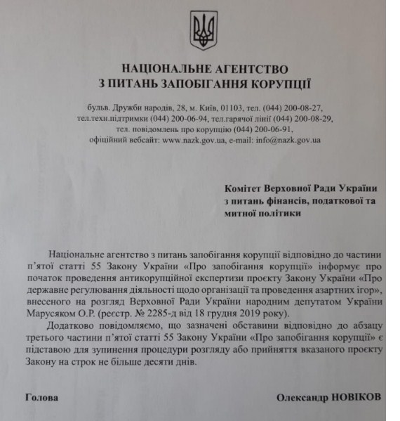 Национальное агентство по предупреждению коррупции (НАПК) запланировало провести экспертизу законопроекта о легализации и госрегулировании азартных игр, что приостановит рассмотрение проекта на срок до 10 дней.