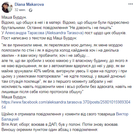 "Но то, что вы сделали с моей мамой в ее собственном доме, к которому я не имею отношения, как вы с автоматами ворвались к ней во двор, как вы почти разрушили 40% мебели, вывернули все ее вещи на пол и при этом с ухмылкой повторяли "не ждите помощи, у вашей доченьки там ситуация похлеще", как вы с первого момента забрали у нее возможность даже позвонить мне и все делали без адвоката, даже не оставив после себя копию протокола обыска…" – продолжает волонтер.