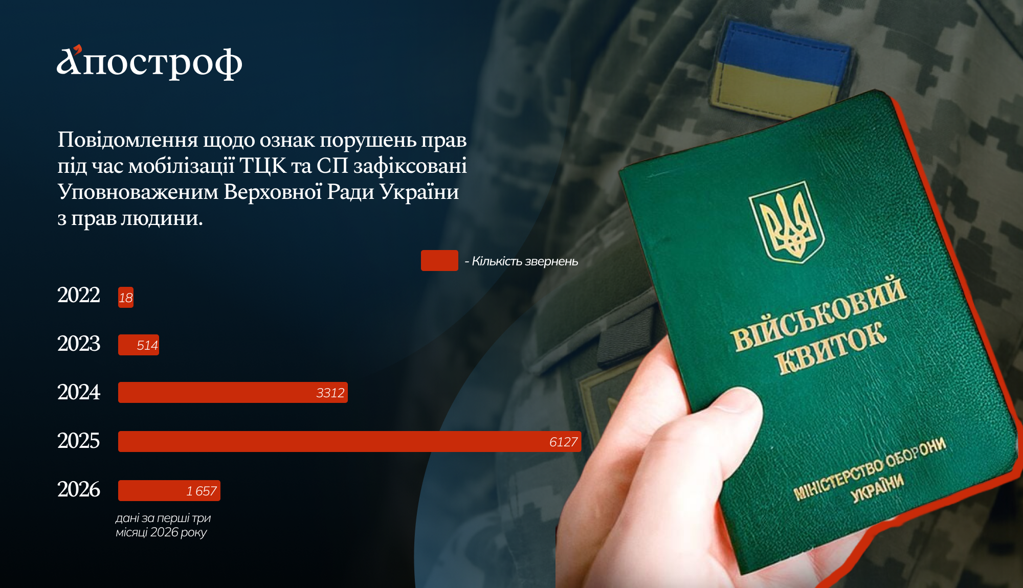 "По результатам рассмотрения Вашего запроса на информацию от 06.04.2026, зарегистрированного №811.13/26/СО от 06.04.2026, поступившего в Секретариат Уполномоченного Верховной Рады Украины по правам человека, сообщаем следующее. По сведениям, имеющимся и полученным автоматизированным путем в системе электронного документооборота Секретариата, учтена информация об уведомлениях о признаках нарушений прав во время мобилизации территориальными центрами комплектования и социальной поддержки... В первом квартале 2026 года поступило и зарегистрировано 1 657 обращений", — говорится в ответе.