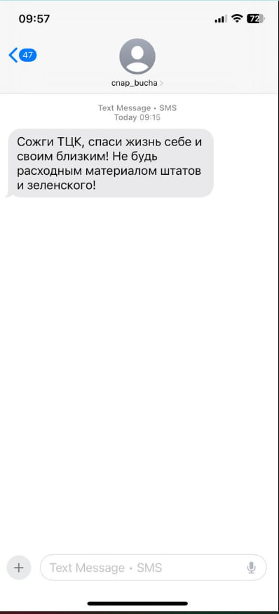 Украинцам на телефоны стали приходить русскоязычные смс-сообщения с призывами сжечь ТЦК.