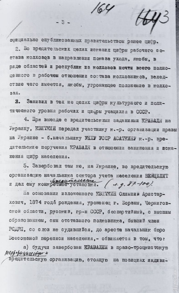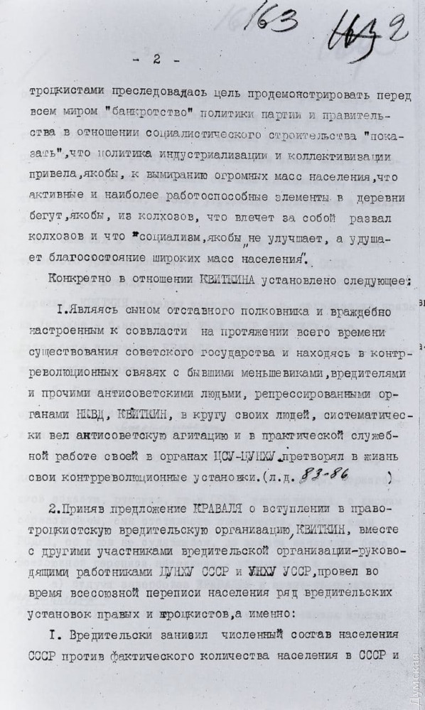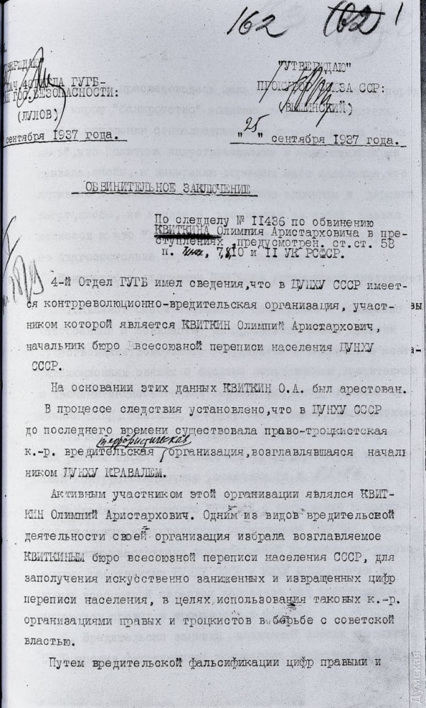 Служба безопасности Украины опубликовала рассекреченные материалы уголовного дела руководителя бюро переписи населения Центрального управления народнохозяйственного учета СССР Олимпия Квиткина, которого советская власть обвинила в "получении искусственно заниженных и извращенных цифр" во время переписи 1937 года.