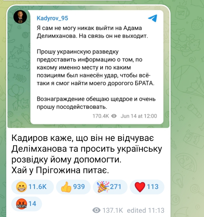 "Я сам не могу никак выйти на Адама Делимханова. На связь он не выходит. Прошу украинскую разведку предоставить информацию о том, по какому именно месту и по каким позициям был нанесен удар, чтобы все-таки я смог найти моего дорогого брата. Вознаграждение обещаю щедрое и очень прошу посодействовать", - написал он.