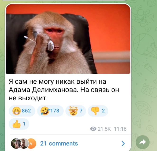 Глава Чечни Рамзан Кадыров пожаловался в сети, что никак не может выйти на Делимханова, которого сегодня ликвидировали украинские разведчики, потому что тот почему-то не выходит на связь. Более того, он начал просить помощи у украинской разведки, обещая "щедрое вознаграждение".