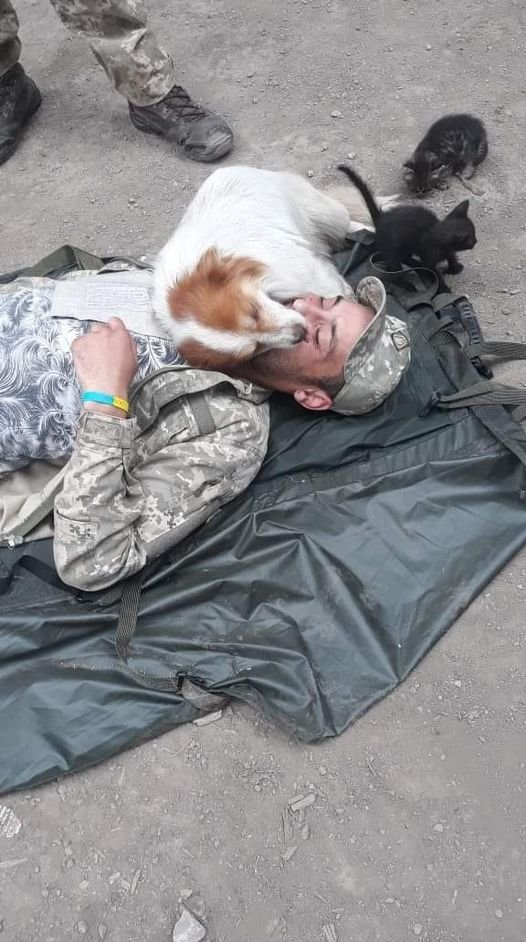 "Им стал вот этот боец, но его пес Бим сопровождал его во время учебной эвакуации, а когда увидел, что глаза парня закрыты, просто лег и решил умереть вместе с ним", - говорится в публикации.