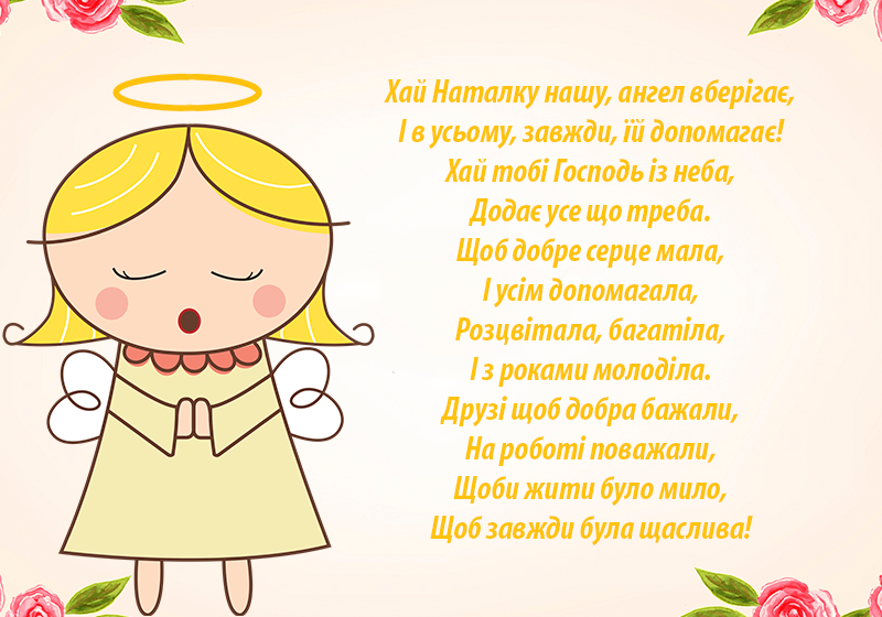 Дорогая Наталья, поздравляю тебя с чудесным праздником – Днем Ангела! Пусть твой добрый ангел дарит твоей душе свет надежды, защищает от всяческих невзгод и дарит здоровье и силу!