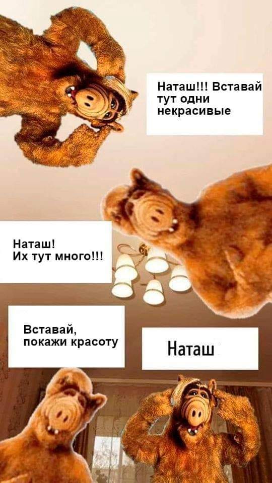 На второй картинке – главный герой известного сериала "Альф" смотрит в камеру сверху вниз и говорит: "Наташа, вставай! Их тут много!".