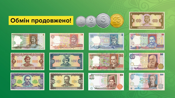 Уже в течение длительного времени из оборота изымаются разменные монеты номиналами 1, 2, 5 и 25 копеек и банкноты номиналами 1, 2, 5, 10, 20, 50, 100 и 200 гривен образцов до 2003 года всех лет выпуска. Эти деньги уже не принимают в магазинах во время наличных расчетов, но их можно обменять на банкноты и монеты нового образца.