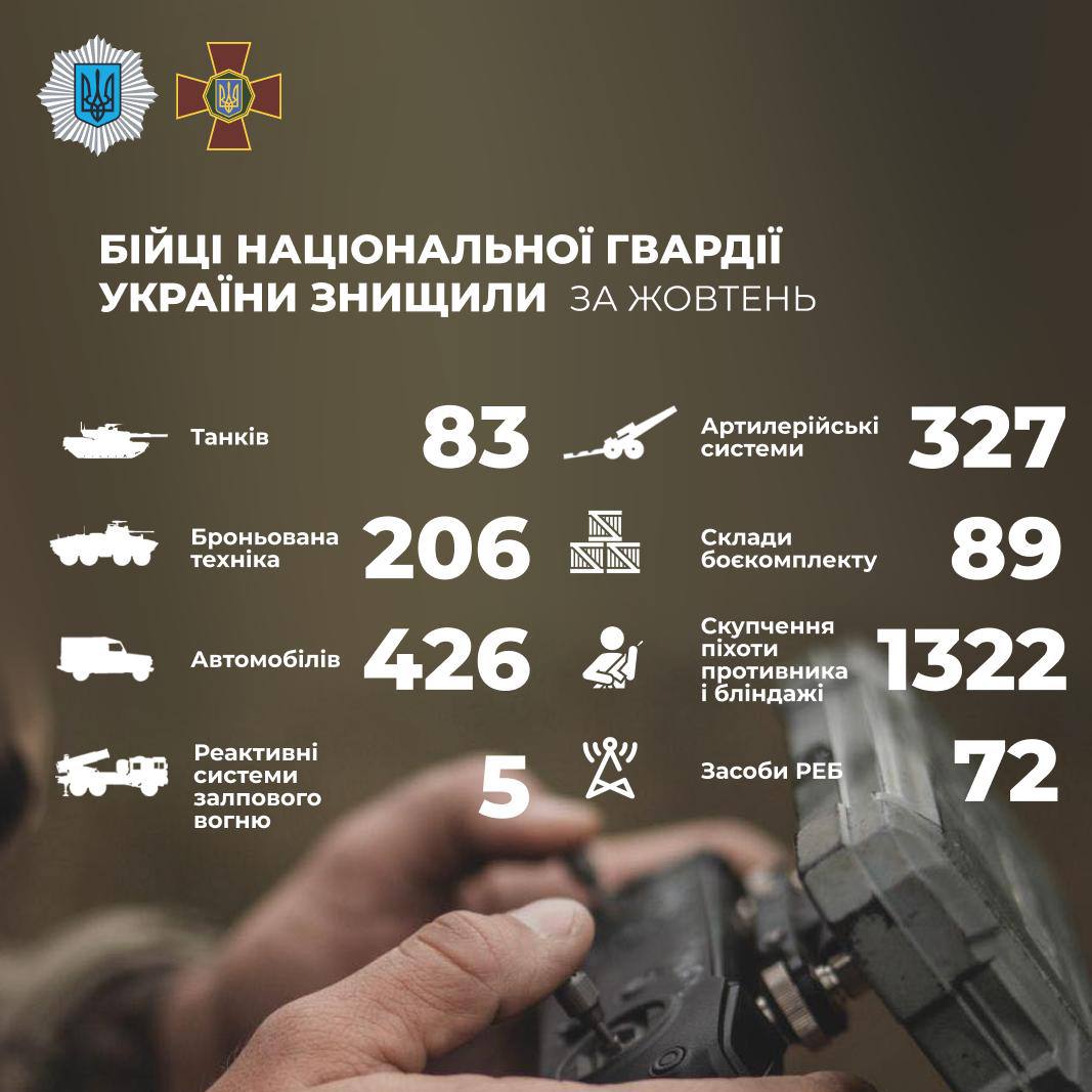 Бойцы Национальной гвардии подсчитали количество уничтоженной техники и живой силы российской оккупационной армии в октябре 2024 года. В частности, военнослужащие ликвидировали более 1,3 тыс. блиндажей и мест скопления вражеской пехоты.