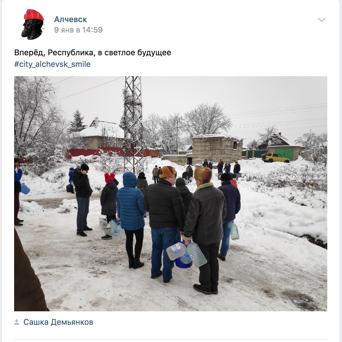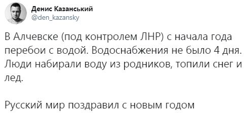 "В Алчевске (под контролем ЛНР) с начала года перебои с водой. Водоснабжения не было 4 дня. Люди набирали воду из родников, топили снег и лед. Русский мир поздравил с новым годом", - написал он.