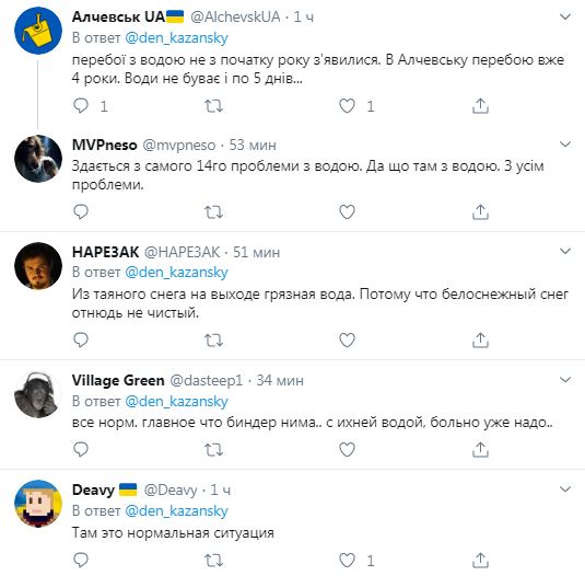 "Перебои с водой не с начала года появились. В Алчевске перебои уже 4 года. Воды не бывает и по 5 дней", "Кажется с самого 14го проблемы с водой. Да что там с водой. Со всем проблемы", "Развивается республика", "Из таяного снега на выходе грязная вода. Потому что белоснежный снег отнюдь не чистый", - пишут в комментариях.