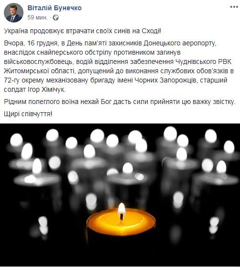 "В День памяти защитников Донецкого аэропорта, в результате снайперского обстрела противником погиб военнослужащий, водитель отделения обеспечения Чудновского РВК Житомирской области, допущеный к выполнению служебных обязанностей в 72-ю отдельную механизированную бригаду имени Черных Запорожцев, старший солдат Игорь Химичук", - написал Бунечко.