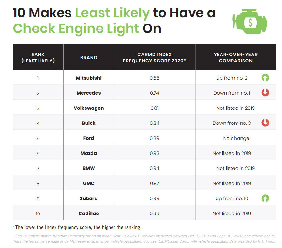 Так, реже всего индикатор, свидетельствующий о возможной неисправности двигателя, срабатывал у автомобилей японской марки Mitsubishi. На второй строчке в рейтинге расположились машины немецкого производителя Mercedes-Benz. Тройку лидеров замкнули автомобили компании Volkswagen.