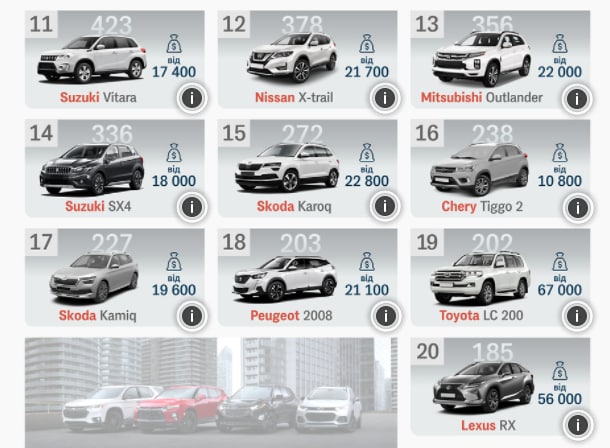 В первую тройку самых популярных входят: Toyota RAV4 (от $27 800), Renault Duster (от $ 19300) и KIA Sportage (от $18 500).