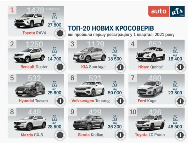 В первом квартале 2021 62% приобретенных украинцами новых авто были представителями класса SUV. Автоэксперты определили, какие модели покупают чаще всего.