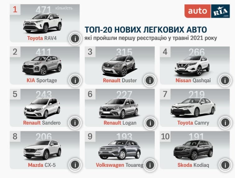 В Украине в мае 2021 года первую регистрацию получили 8 430 легковых автомобилей - среди производителей в лидерах Toyota и Renault.