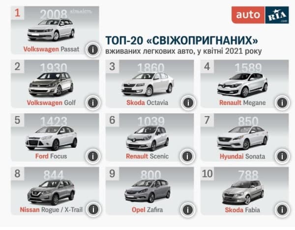 В апреле 2021 года импортеры авто с пробегом установили рекорд , поставив в Украину 40,5 тысяч легковых автомобилей, самой популярной моделью среди которых остается Volkswagen Passat .