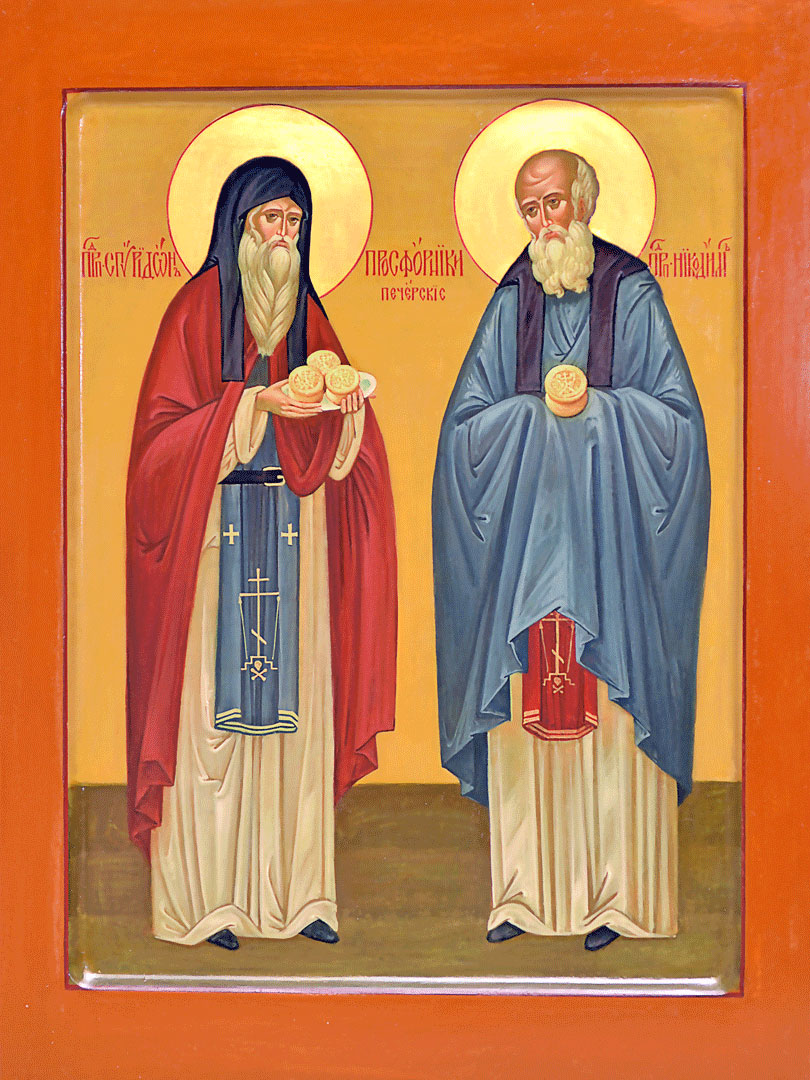 Преподобные Спиридон и Никодим жили в XII веке и были монахами Киево-Печерского монастыря. Их также называют "просфорниками", потому что монахи занимались выпеканием просфор для церковных служб. Святые обладали даром чудотворения. Мощи преподобных находятся в Ближних пещерах Киево-Печерской лавры.