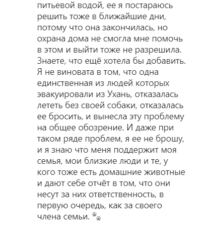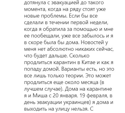 "Украина снова дотянула с эвакуацией до такого момента, когда стоят уже новые проблемы. Если бы все сделали в течение первой недели, когда я обратилась за помощью и мне ее пообещали, уже все забылось бы - и я вскоре была бы дома. Новостей у меня нет абсолютно никаких сейчас, что будет дальше. Сколько продлиться карантин в Китае и как я попаду домой", - добавила девушка.