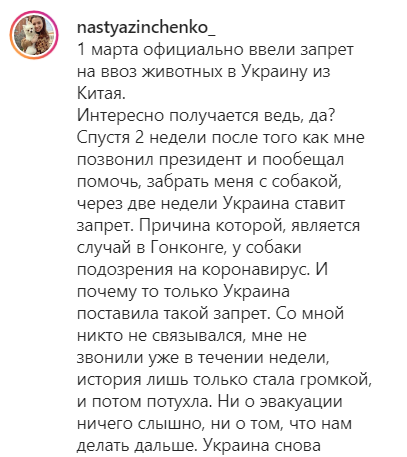 Украинка Анастасия Зинченко, которая не покинула охваченный коронавирусом Китай из-за собачки, взволновала сеть новым заявлением.