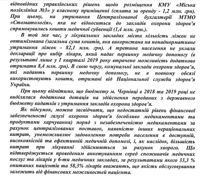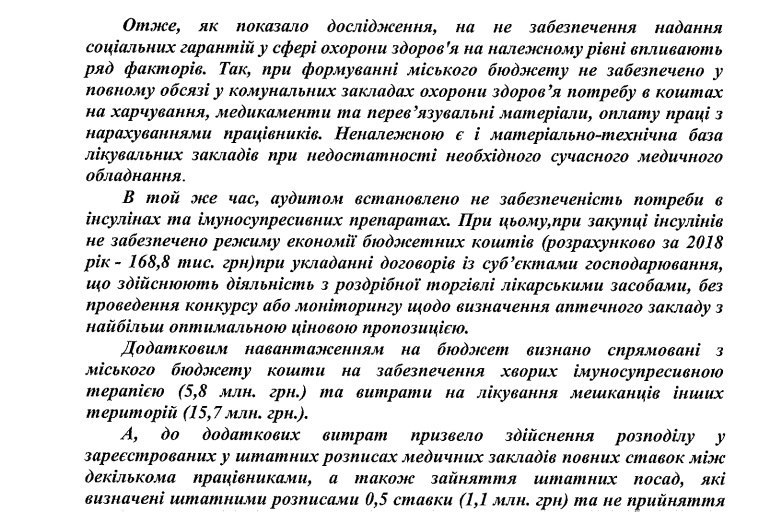 Аудит установил, что в Черновцах не удовлетворена потребность населения в лекарствах, в частности в инсулине и имуносупрессивных препаратах. Также отмечается неоптимизированность количества коек в больницах.