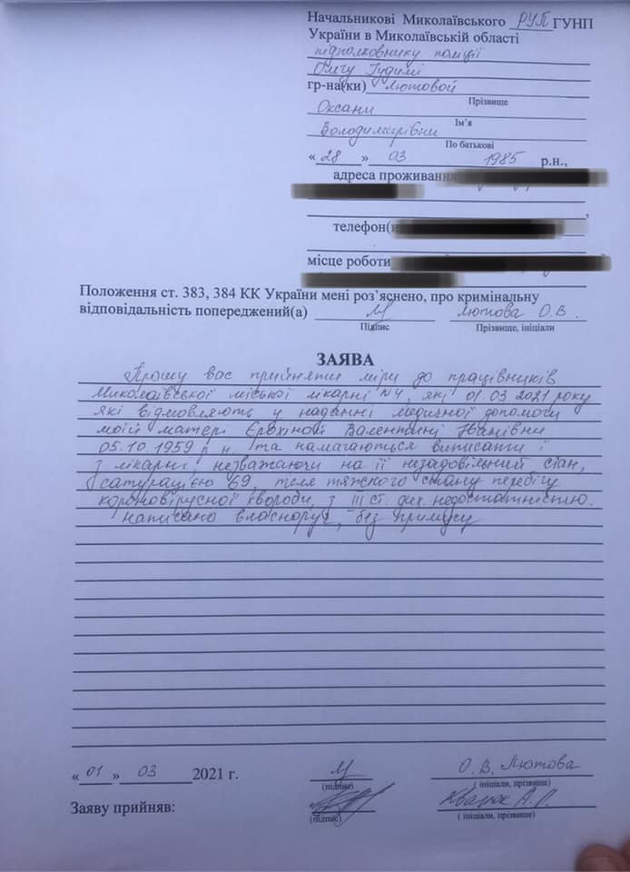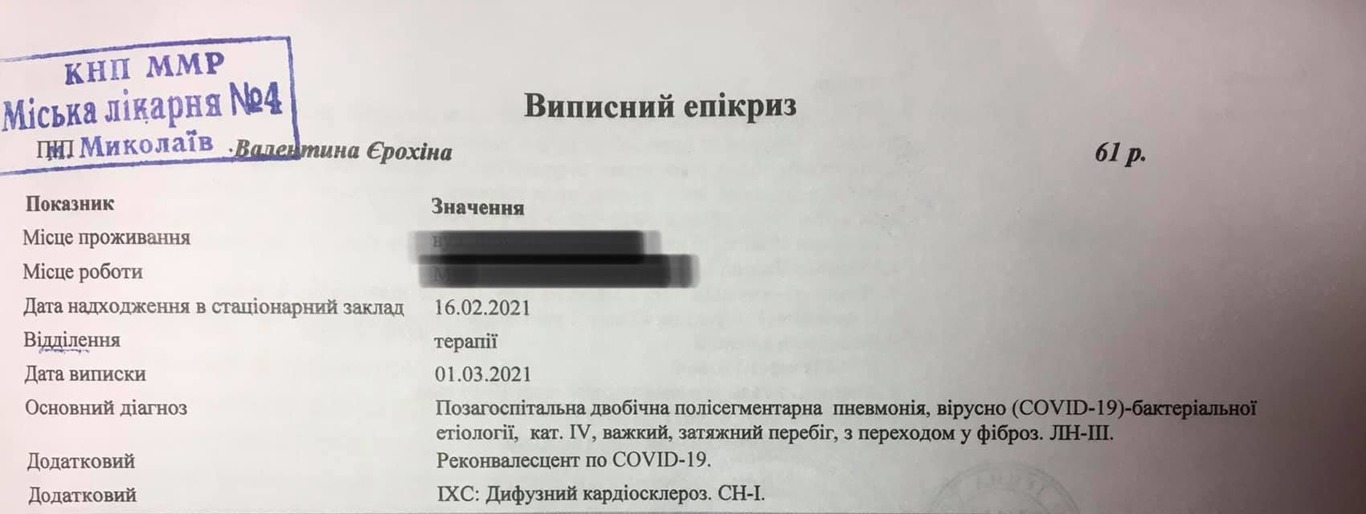 "Через три дня после реанимации (16.02.2021г.) ее перевезли в ММЛ-4, для продолжения лечения (по месту жительства). Общее время пребывания в ММЛ-4 составило15 дней (она в реанимации лежала дольше - 1,5 мес!!!). 01.03.2021г. маму и меня поставили перед фактом, что мы должны покинуть больницу сегодня !!! предоставили выписку, с целью дальнейшего лечения у семейного врача", - сообщила женщина.