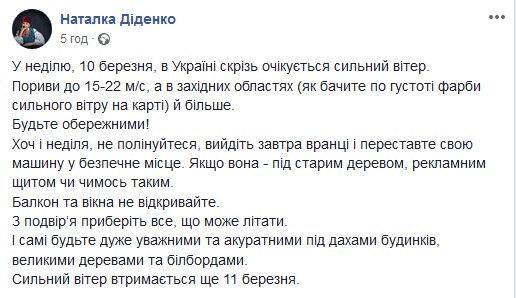 Об этом сообщает на своей странице в Facebook синоптик Наталья Диденко.