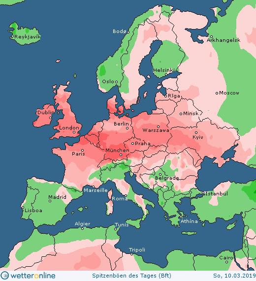 Карта ветров: чем краснее зона, тем сильнее ветер.