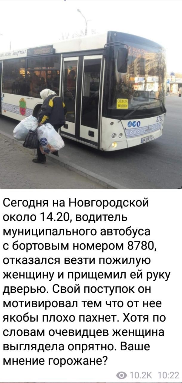 В 14:20 водитель автобуса МАЗ-203 с бортовым номером 8780, который ехал в направлении остановки БК ЗАлК, грубо вытолкнул из салона пожилую женщину и прищемил ей дверью руку. Свой поступок объяснил тем, что, якобы, пассажирка выглядела неряшливо и от нее плохо пахло.