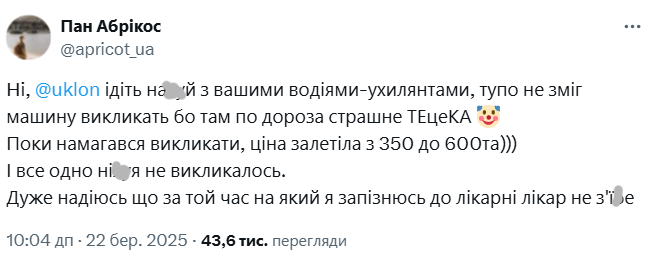 "... идите на**й с вашими водителями-уклонистами, тупо не смог машину вызвать, потому что там по дороге страшное ТЕцеКА. Пока пытался вызвать, цена залетела с 350 до 600та))) И все равно ни**я не вызывалось. Очень надеюсь что за то время на которое я опоздаю в больницу врач не сь**ет".