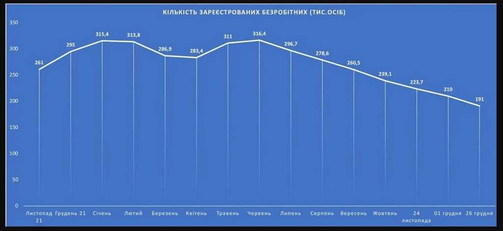 В конце года в Украине на десятки тысяч снизилось количество безработных – из официально зарегистрированных 191 тысяч безработных в ноябре осталось 159 тысяч на дату 26 декабря 2022 года.