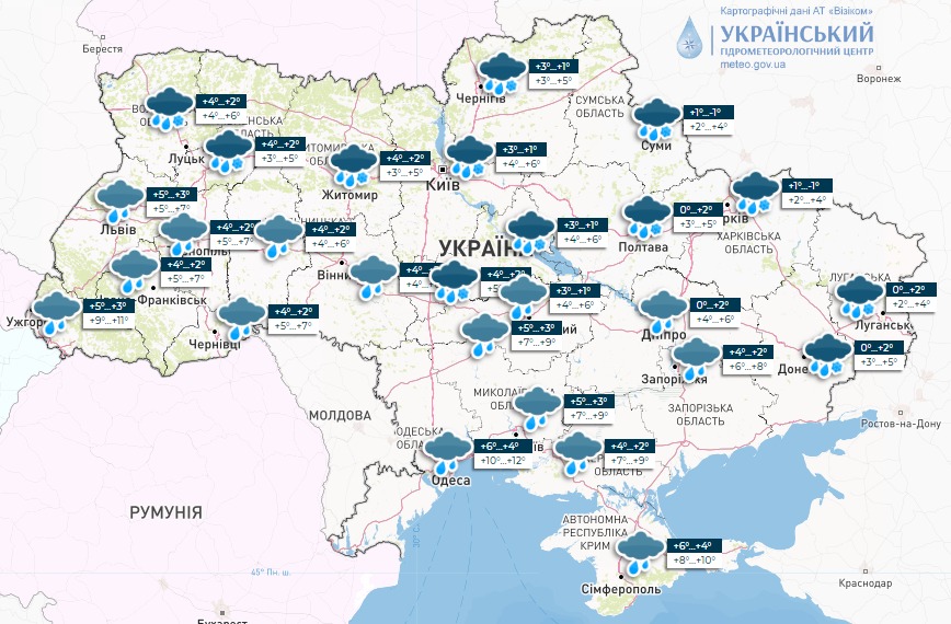Температура ночью от 4° тепла до 1° мороза; днем 2-7° тепла, на Закарпатье и в южной части 6-11° тепла.