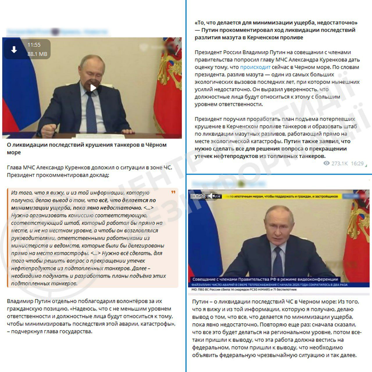 В Центре считают, что Путин, понимая всю серьезность проблемы, подобными заявлениями пытается переложить ответственность за провал по ликвидации последствий загрязнения нефтепродуктами на должностных лиц.