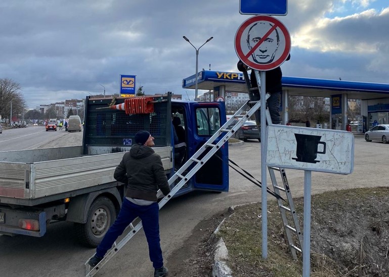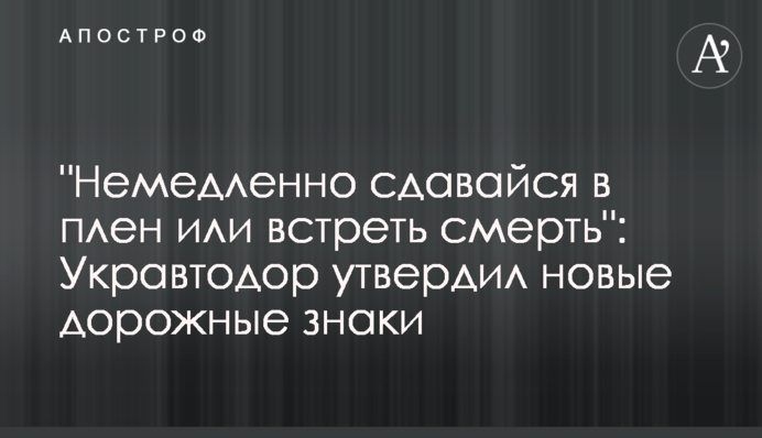 Работниками установлено новый дорожный знак "Оккупантам движение запрещено", который указывает врагу: "Немедленно сдавайся в плен или встреть смерть".